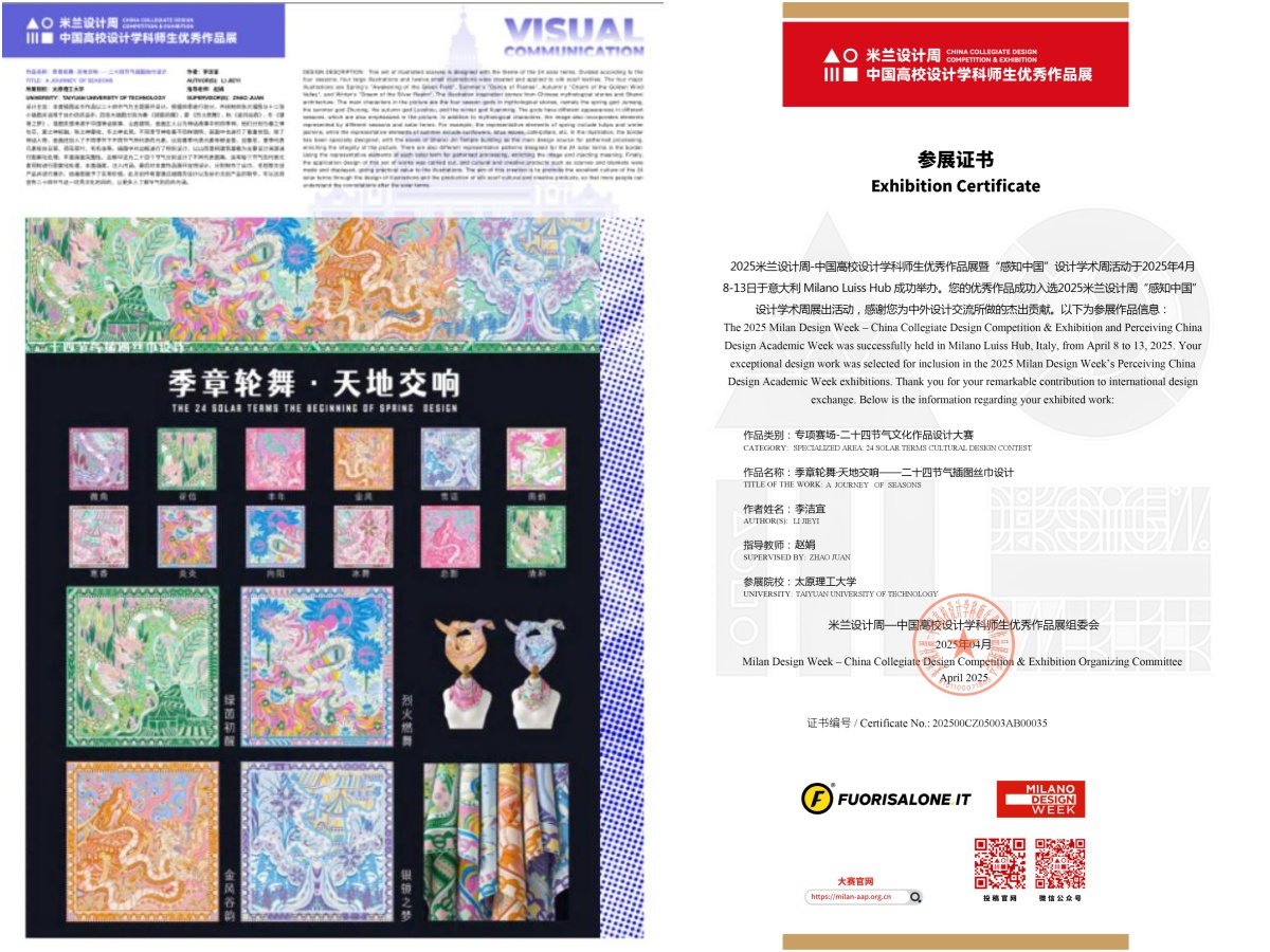 此次赴米兰设计周展出的中国高校师生优秀作品近150件,我校学生李洁宜同学的作品《季章轮舞·天地交响》有幸成为此次展出的优秀作品之一。此次参展作品涵盖了视觉传达设计、产品设计、环境空间等多个类别,充分展示了中国设计教育的丰硕成果,有力推动了中意欧设计教育领域的交流与合作。展出现场吸引了众多国际观众欣赏讨论。